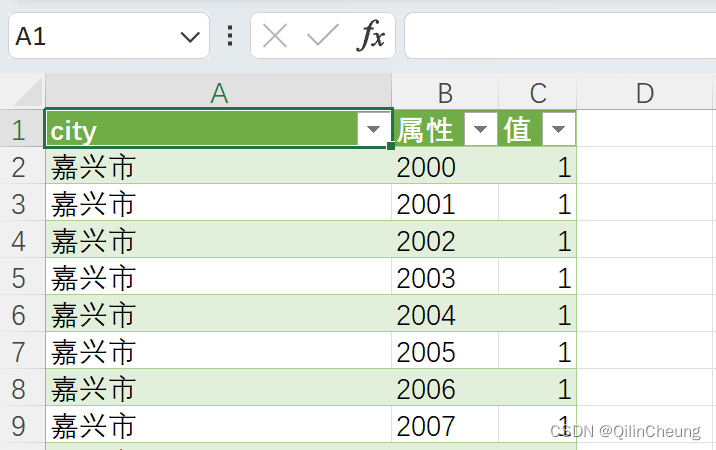 面板数据本身还可以进一步分类。比如说,按照时间和个体维度的相对大小,可以分为长面板和短面板;按照数据的缺失情况,可以分为平衡面板和非平衡面板。这里,我们主要介绍平衡面板的构建,一是简单常见,二是从平衡面板转非平衡面板非常容易(简单删除几个观测值即可),更具一般性。具体的操作可以由不同的软件来实现,本文主要介绍三种:Excel,Python,Stata。下面,我们以构建2000-2024年全国337个城市(地级市和直辖市)的平衡面板为例,详细介绍各种类型的软件操作。