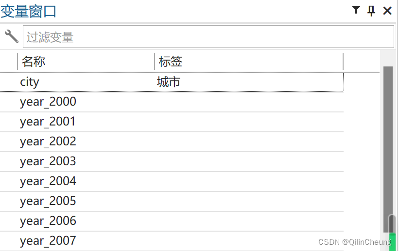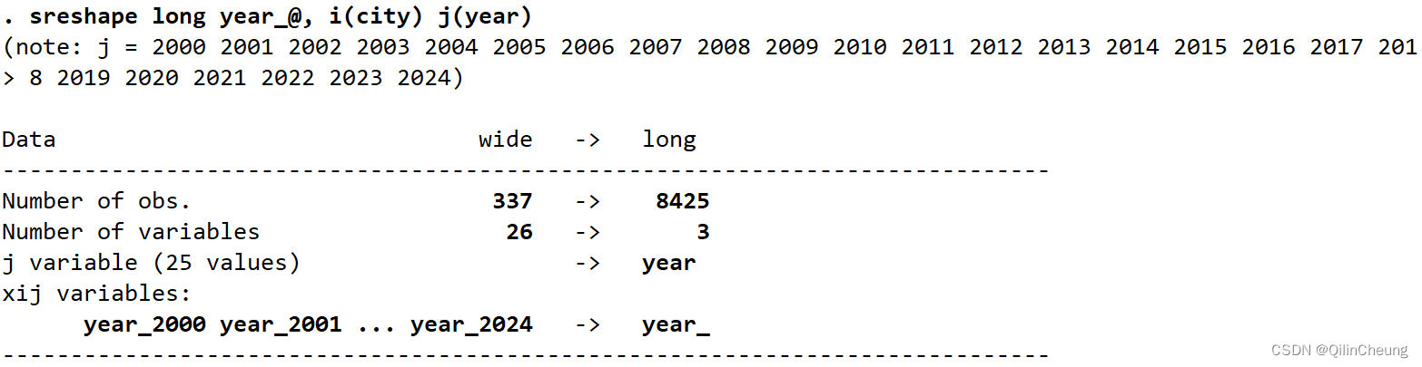 use city_list.dta,clear forvalues i = 2000(1)2024 { gen year_`i' = 0 } sreshape long year_@, i(city) j(year) drop year_其中,forvalues{}这段代码运行后,会生成一系列年份变量: