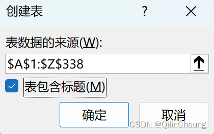 点击表格后,会弹窗一个界面,注意表数据是否选择了我们需要的部分,并记得勾选“表包含标题”,最后点击确定即可。