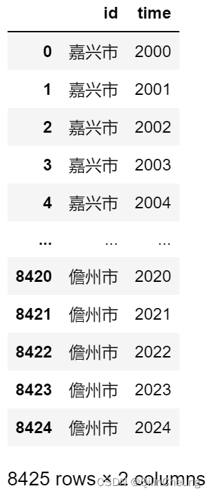 import pandas as pd def panel_build(input_id_list,input_time_list): ''' --input-- input_id_list: the list of individuals input_time_list: the list of time ----------------------------- --output-- return balanced panel data ''' output_id_list = [] output_time_list = [] for i in input_id_list: for j in input_time_list: output_id_list.append(i) output_time_list.append(j) return pd.DataFrame({'id':output_id_list,"time":output_time_list})例如,我们有一个city_list和一个year_list:
