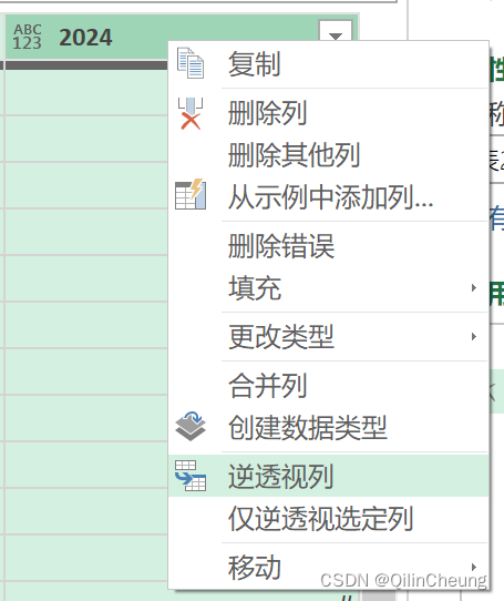 第六步,鼠标右击最后一个时间变量,出现下拉菜单,选择逆透视。