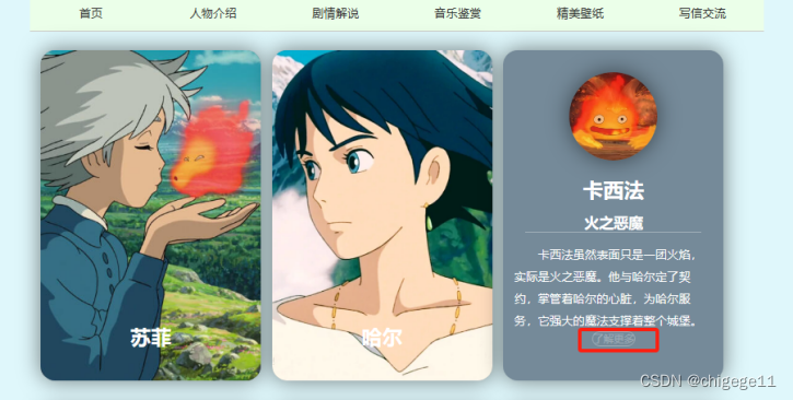 2.人物介绍:本页面主要制作 6个人物小卡片,每个卡片上有人物的名字、性格、照片,分别介绍了苏菲、哈尔、卡西法、马鲁克、荒野女巫、莎莉曼。