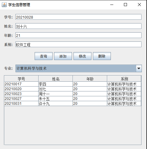 修改学生信息:用户可以选择要修改的学生,并可以更新学生的姓名、学号、年龄、系别等信息。