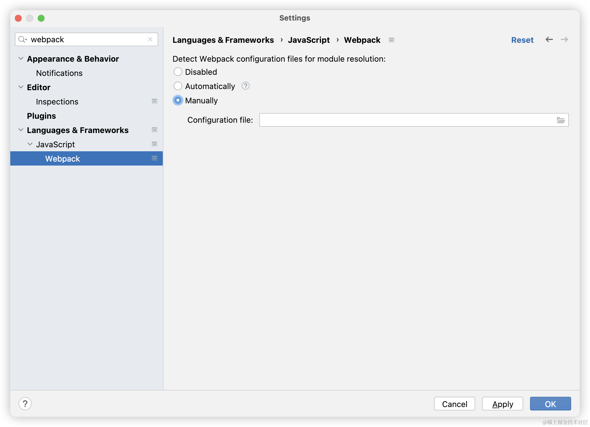 在你的本地磁盘某个位置新建一个 webpack.config.js 文件,然后导入这边的配置里面,要选择 Manually 才行。