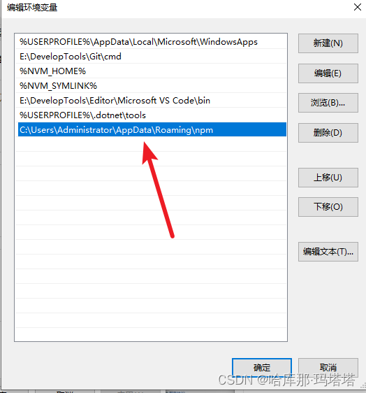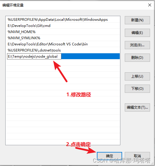 3.8 将默认的C盘下【AppData\Roaming\npm】修改成【node_global】的路径,修改完后,点击【确定】