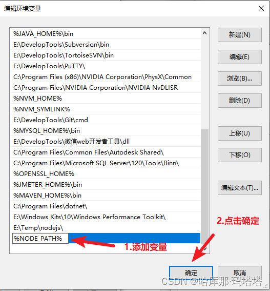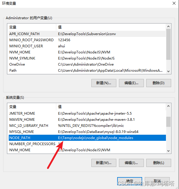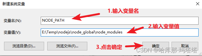 3.5 变量名输入“NODE_PATH”,变量值输入“你的安装路径\node_global\node_modules”,填写完,点击【确定】