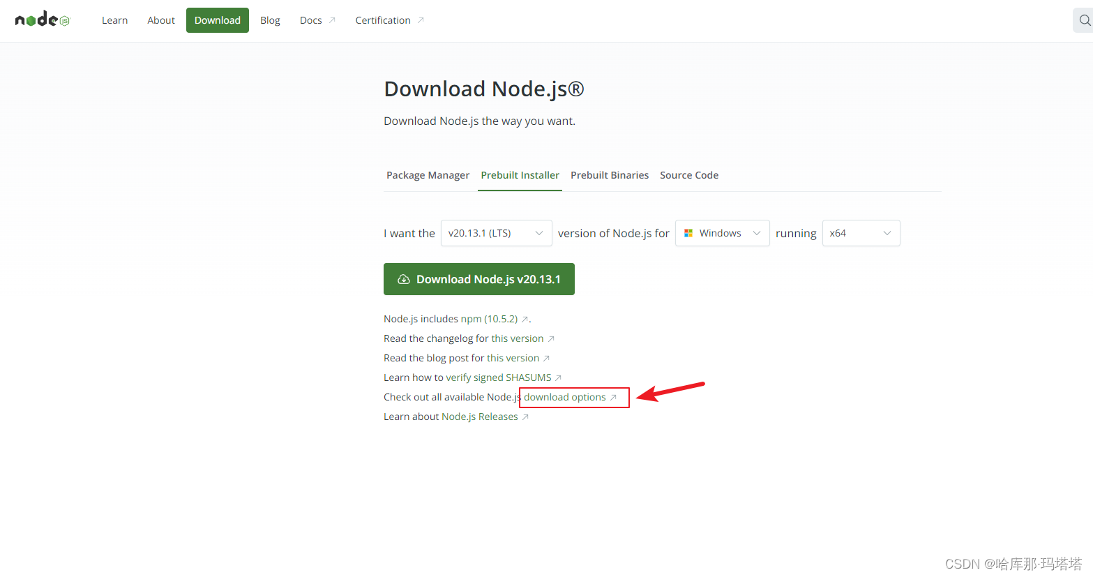 如果不想使用命令行安装,也可选择下载预构建的安装文件,如下图,选择对应你系统的Node.js版本,这里我选择的是Windows系统、64位