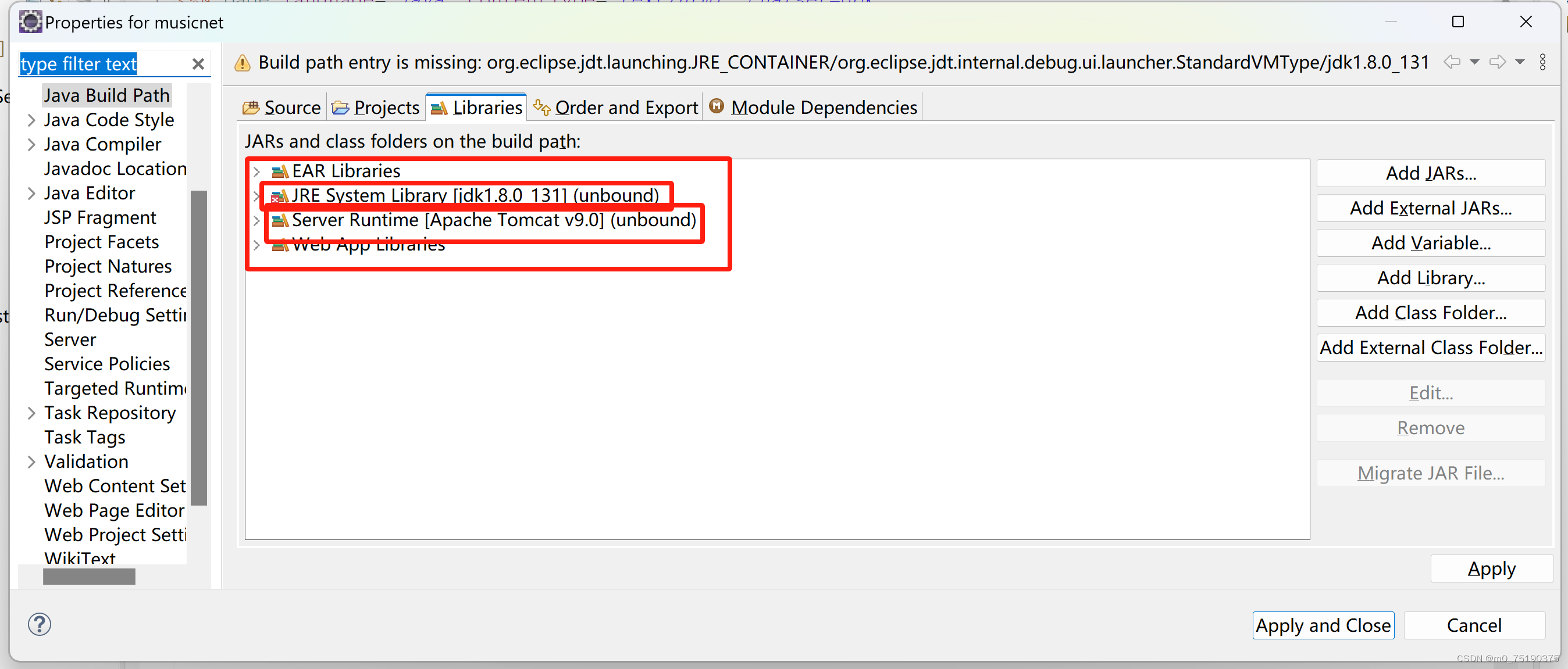 选中这两个库然后点击Remove删掉。(unbound说明这个两个库实际上 是没有引入进来的,所以需要我们再引入整个却的库)