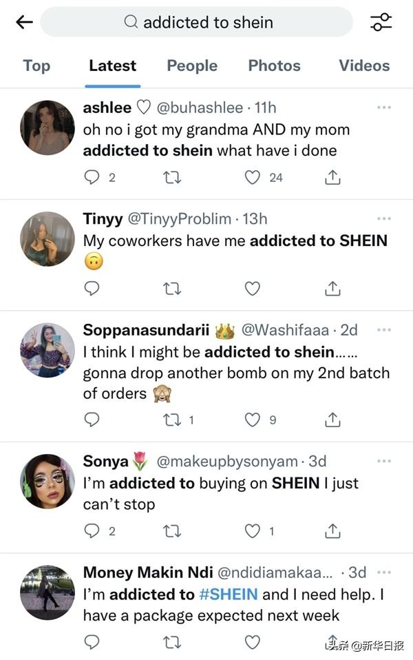 SHEIN是一家成立于中国南京的跨境电商品牌,短短几年时间征服了无数美国消费者,在美国的校园、妈妈圈等各个群体中走红。在Twitter、Facebook、YouTube上搜索“addicted to Shein”的词条,有大量网友承认,自己对SHEIN上瘾了。