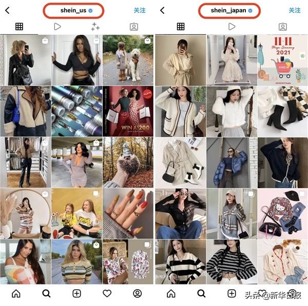在各大社交媒体上,SHEIN会建立20多个子账号,做更细分的内容。比如他们会根据当地的文化特色选择适合的服装风格。其在日本账号发布的服装风格是甜美、内敛的;而到了美国账号shein_us里,服装画风则变得更加开放,模特的姿势也会更大胆。