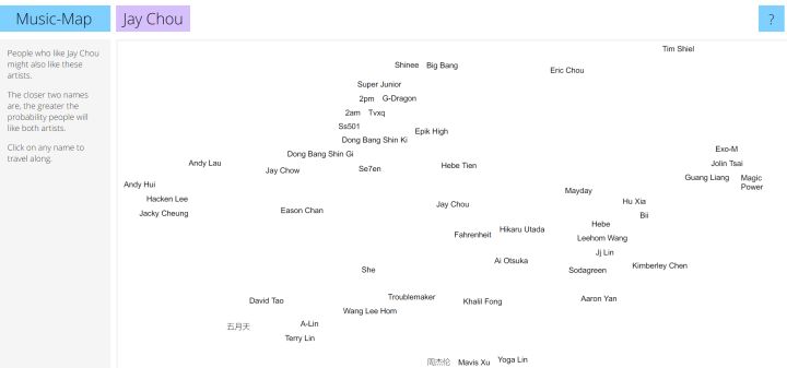 Music-Map,就像它的名字,通过输入歌手的名字(目前仅支持英文搜索),它会返回类似“歌手地图”的结果。