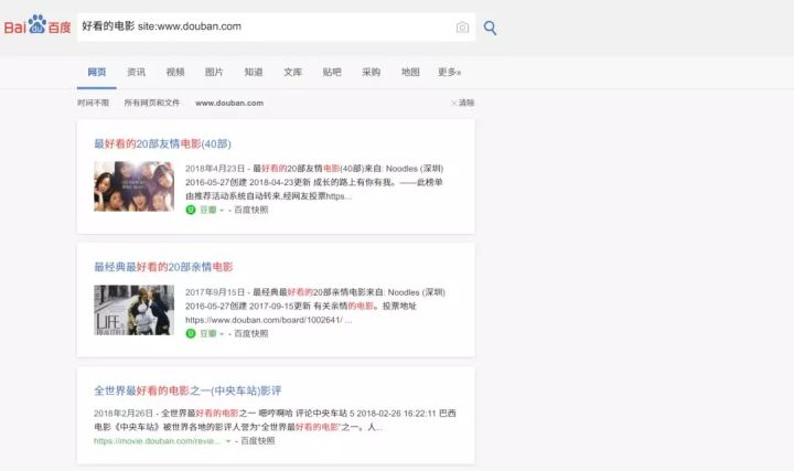 举个例子,我想找好看的电影,希望只在豆瓣上进行搜索,这时,我可以在搜索框中输入,好看的电影 site:douban.com ,得到的搜索结果均来自于豆瓣。