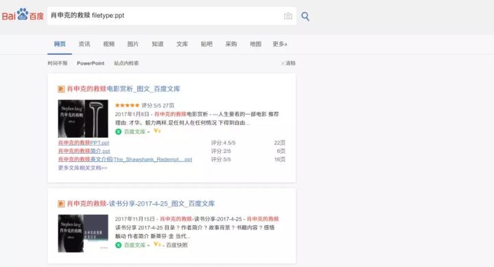 举个例子,我想搜索介绍电影《肖申克的救赎》相关的PPT,可以在搜索框中输入,肖申克的救赎 filetype:ppt ,得到的结果都为PPT格式的文件了。