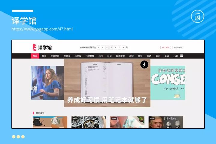 但如今,有了译学馆,你有了新的选择。译学馆,翻译了来自全球的优质视频,内容涵盖科技、教育、时尚、绘画和计算机等方面。为了保证内容的更新,译学馆招募了28000多名译者加入了翻译工作,若你有兴趣,可以前去申请成为译者。