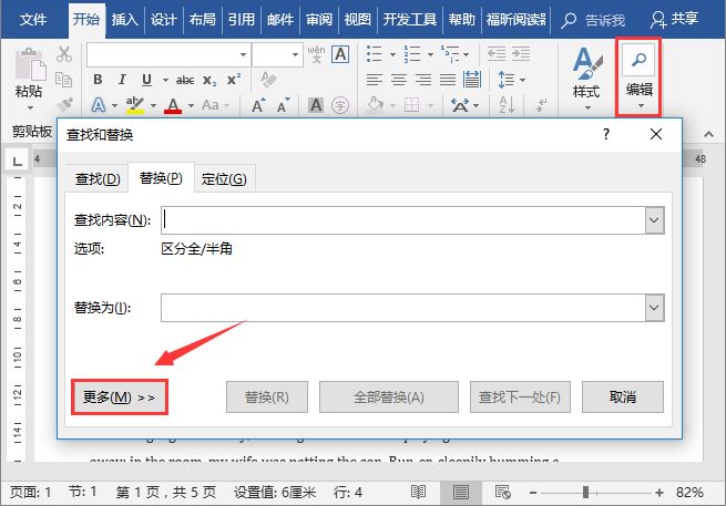 (1)单击【开始】-【编辑】-【替换】按钮或按【Ctrl+H】组合键打开“查找和替换”对话框,然后单击“更多”按钮。