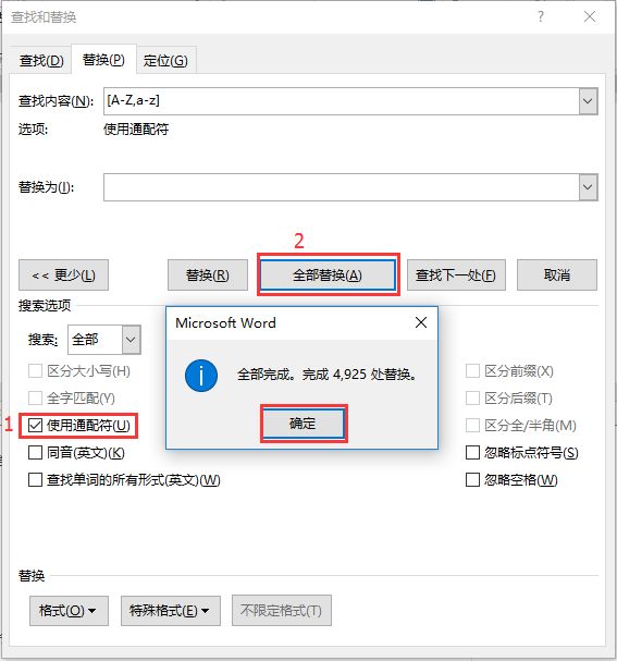 (2)勾选【使用通配符】,点击【全部替换】按钮完成替换。
