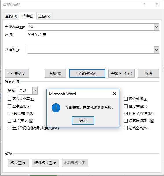 (3)单击“全部替换”按钮,在“全部完成”提示框中单击“确定”按钮。