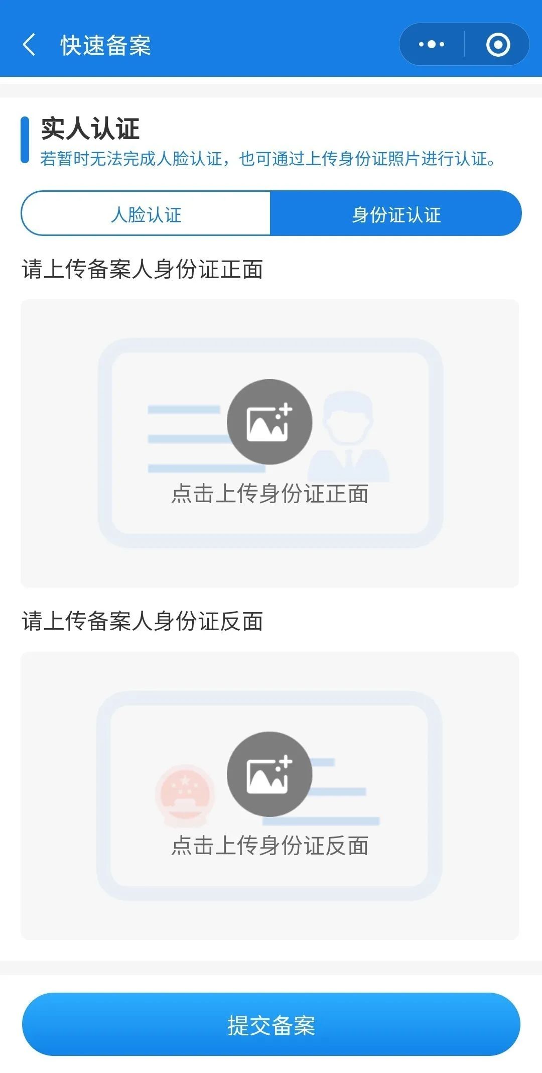 ④替他人录音需要对备案人进行实人认证,可直接通过人脸认证或上传备案人身份证正反面进行验证。 认证成功后,您可以【提交备案】。
