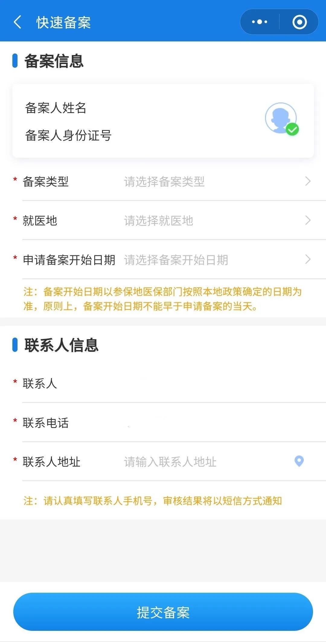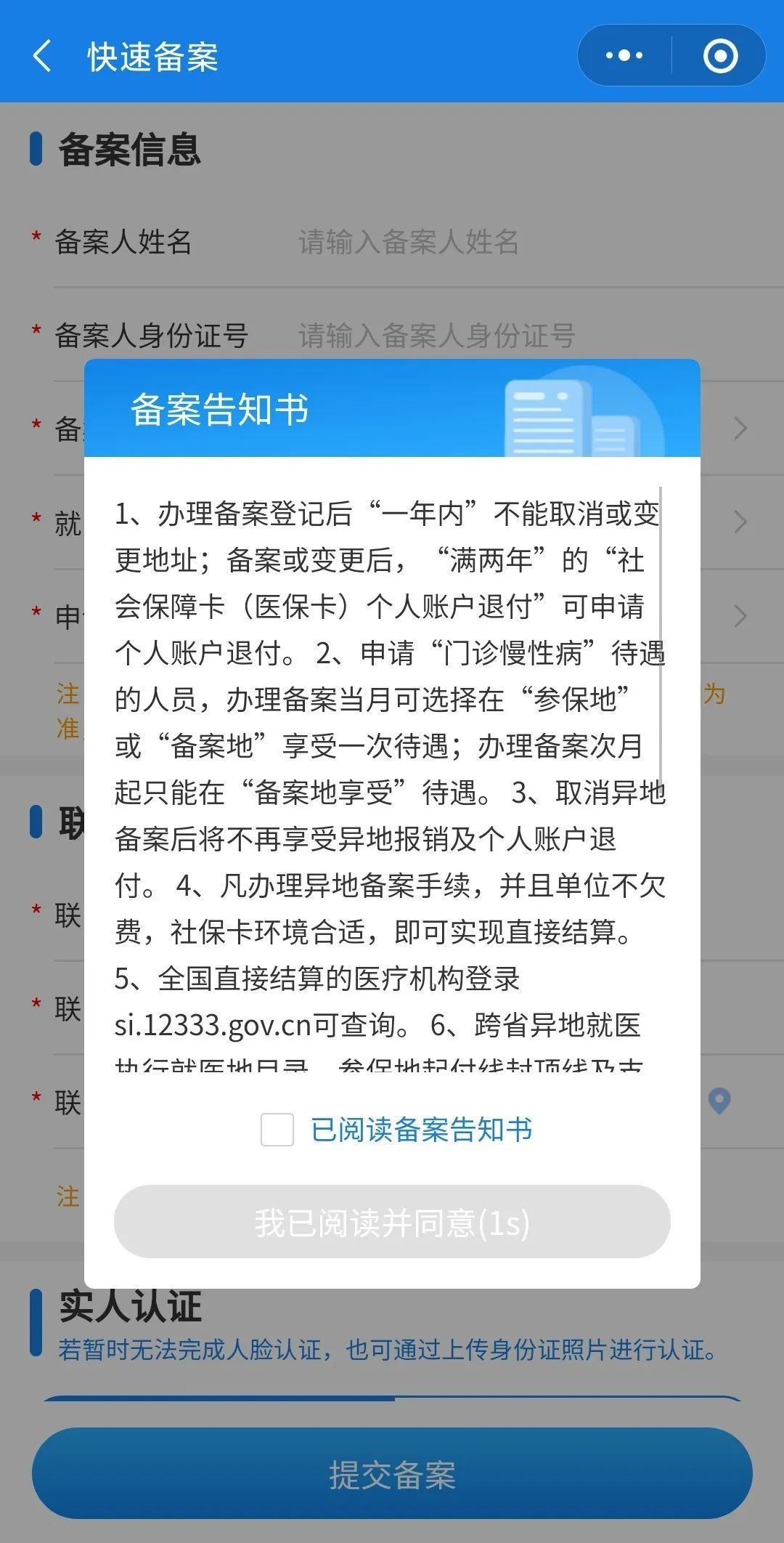 ②仔细阅读并同意备案通知后,开始填写备案申请信息。