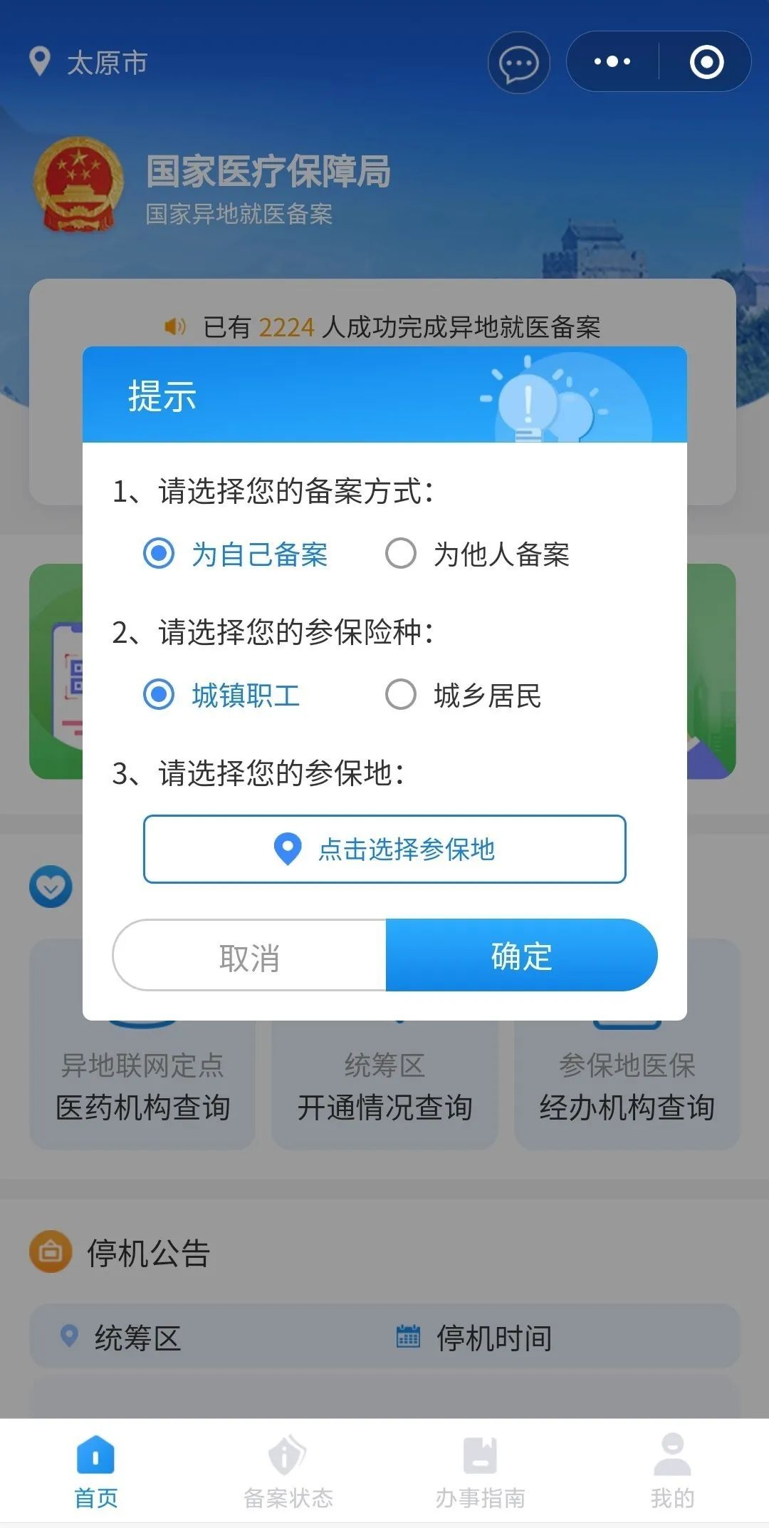 ①点击【他人备案】,选择备案人的保险种类和参加地点,确认后进入申请。