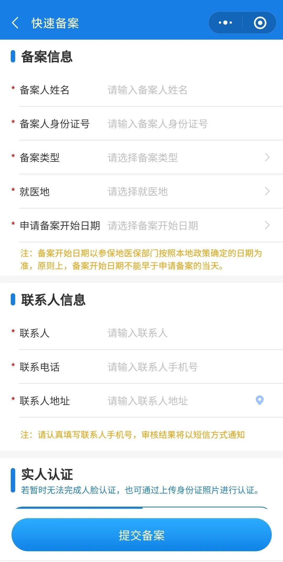 ③按要求填写备案人的实际信息和联系方式,并根据所选备案类型上传相应的证明材料或个人承诺书。
