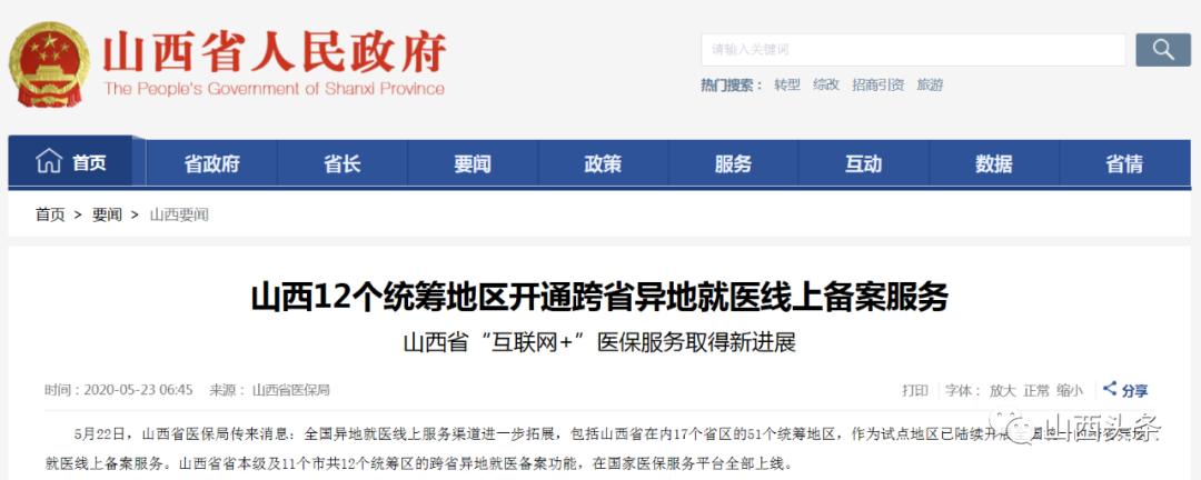 5月22日,山西省医保局发消息称,全国异地就医网上服务渠道进一步拓展,山西省等17个省区51个协调地区已陆续开展全国统一跨省份和边远地区作为试点地区。 医疗在线归档服务。 山西省省级和11个市,共12个协调区,具备跨省异地就医备案功能,全部在国家医保服务平台上上线。