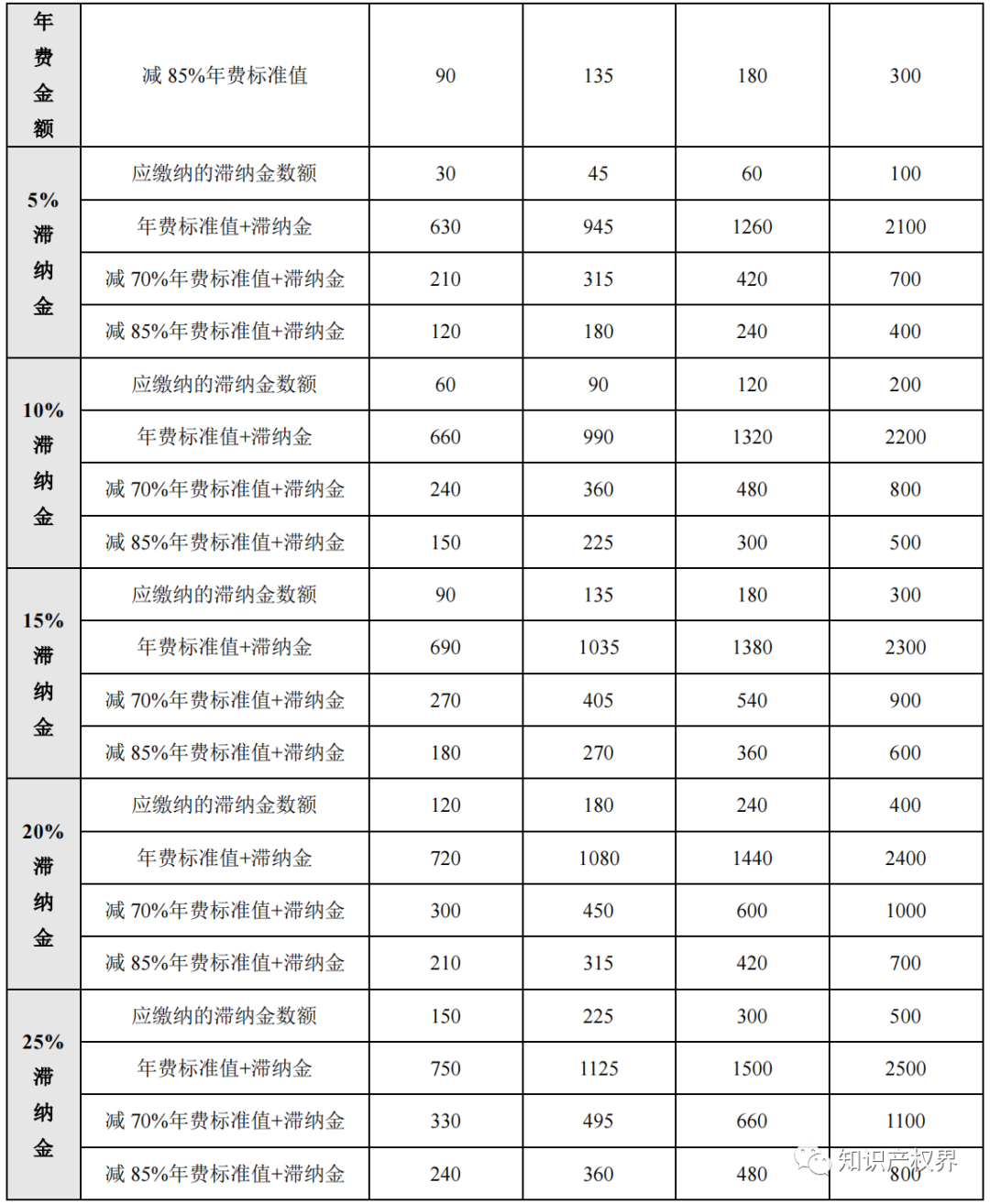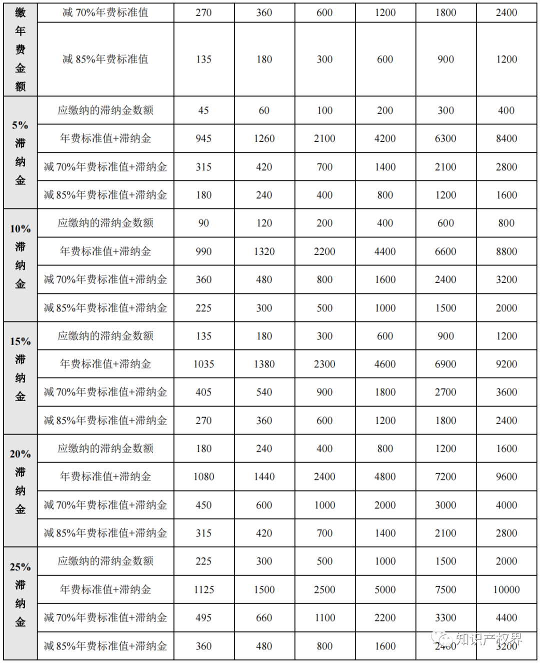 (一)专利权人未按时缴纳年费(不包括授予专利权当年的年费)或者缴纳金额不足的,可以自年费期满之日起六个月内补交。 补缴时间超过规定期限但不足1个月的,不缴纳滞纳金。 逾期缴款时间超过规定时间一个月以上的,按照下列计算方法缴纳相应金额的滞纳金: