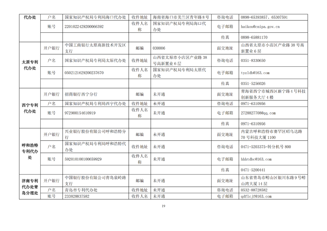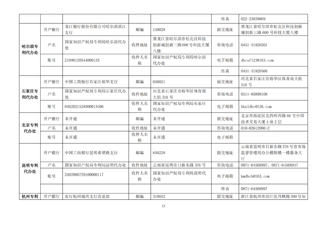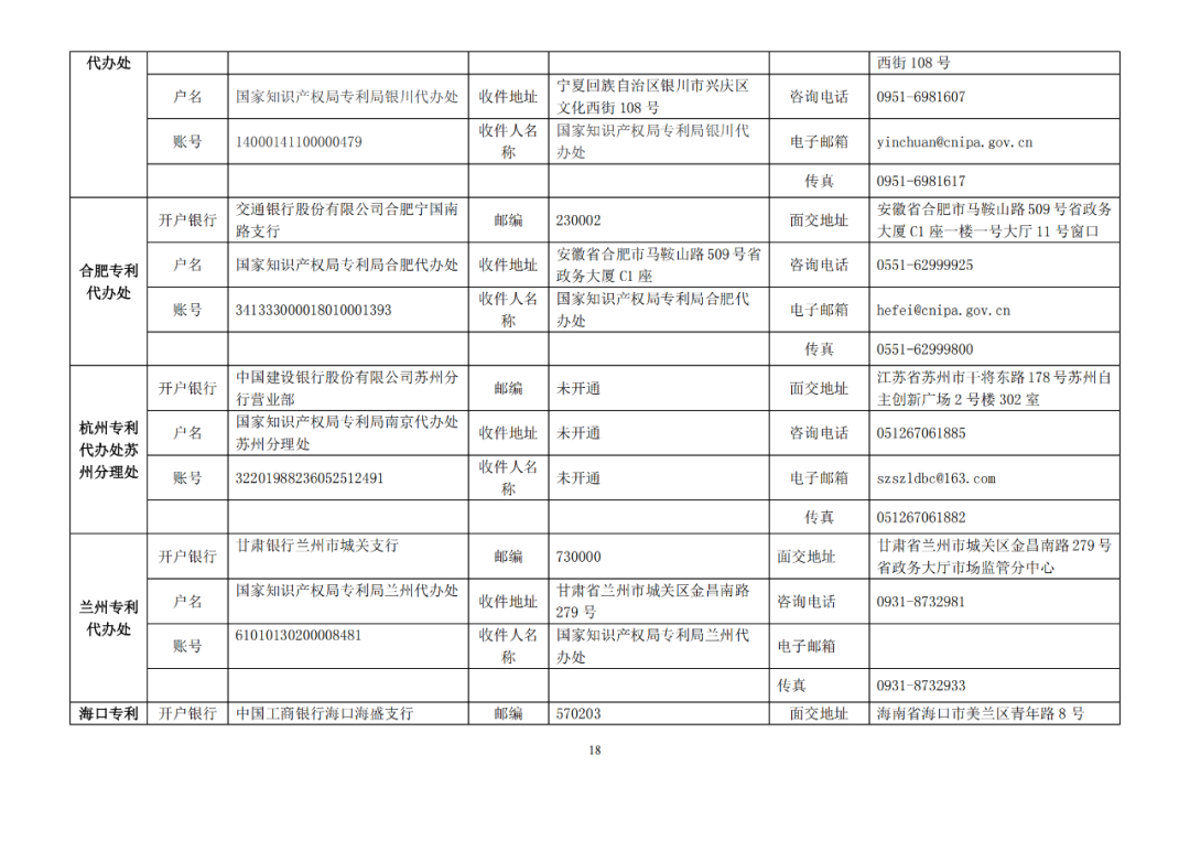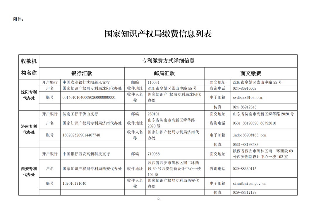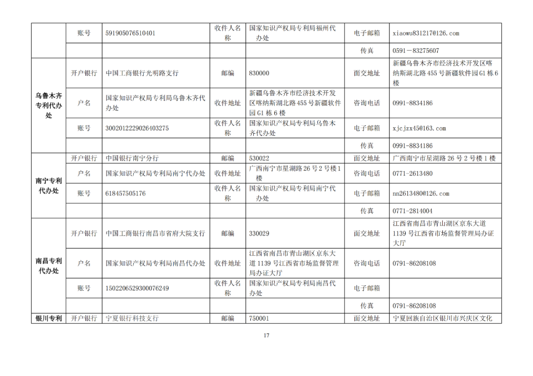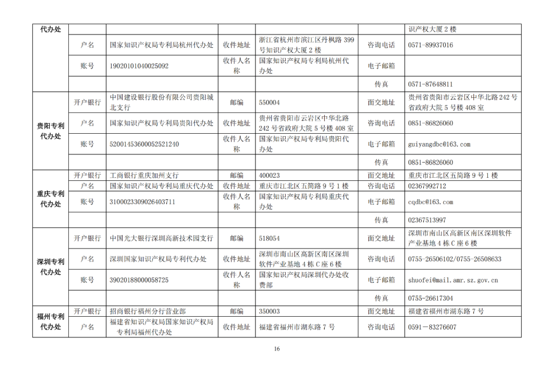 通过银行或邮局汇款的,付款人可根据辖区,汇至全国最近的34家专利代理机构的银行账户或邮局地址。 各代理机构地址信息、银行、邮局账户信息及联系电话请参见缴费指南附件,或登录国家知识产权局官网相关链接中的代理机构页面查看。