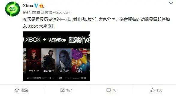 18日,XBOX官方微博发文宣布“动视暴雪即将加入XBOX大家庭”。 彭博社爆料称,微软斥资687亿美元现金,溢价45%,即每股95美元收购动视暴雪,使微软成为全球营收第三大游戏开发商,仅次于腾讯和索尼。