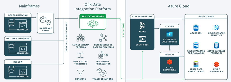 Qlik数据集成支持将大型机数据实时无缝移动到 Microsoft Azure Synapse、Azure HDInsight 和/或 Azure Event Hub。Qlik Replicate 解决方案从 40 多个数据源中提取数据,包括 Db2 for z/OS、IMS 和 VSAM 以及中端 IBM Db2 for I (DB2/400; iSeries;AS/400) 和 IBM DB2 for LUW 通过我们的变更数据采集(CDC)技术实时传输。