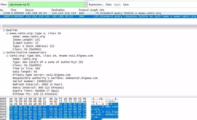 我们来看看DNS解析过程。 客户端进行DNS查询,DNS服务器查询后返回“NO such name A w”的结果。 可以看到,DNS服务器执行查询后,找不到这样的结果。