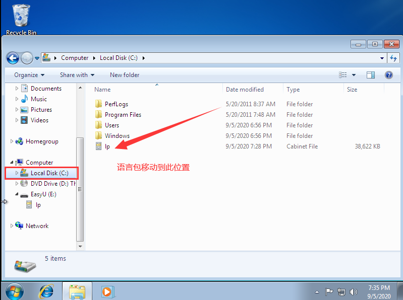1、将中文语言包lp.cab放到C盘的根目录