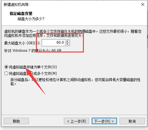 分配虚拟机系统大小,不少于60GB; 选择底部的“存储为单个文件”; 然后继续下一步