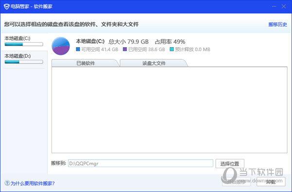 2、选择要移动的磁盘盘符后,QQ电脑管家会在界面左侧扫描您电脑中已安装的软件以及该磁盘的大文件(大于50M的文件);