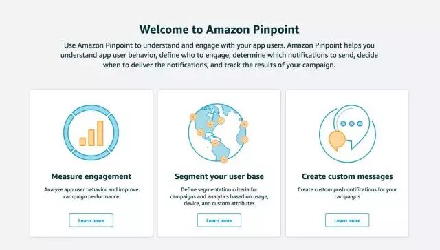 Amazon Pinpoint 入门非常简单。 首先,AWS Mobile Hub 指导您将 AWS Mobile SDK 与您的应用程序集成。 接下来,您定义目标细分、广告并指定投放计划。 广告投放后,Pinpoint会提供相应的数据指标,方便您分析、跟踪广告效果。
