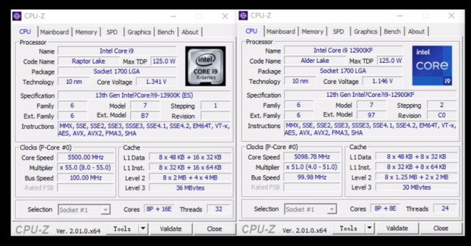 在CPU-Z基准测试中,相比i9-12900KF,i9-13900K单核性能提升9.4%,多核性能提升高达46.3%,得分高达16605; 在CineBench R23中,多核性能提升40.25%; 在 GeekBench 5 测试中,多核性能提升高达 22.78%。