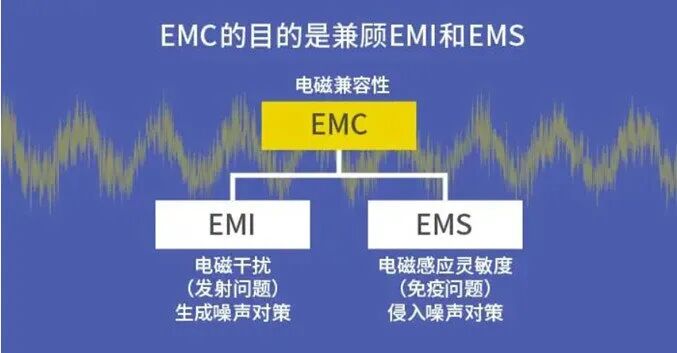 因此,电子设备需要同时具备防止自身产生噪声的EMI(Electro Magnetic Interference)对策和防止自身受到影响的EMS(Electro Magnetic Susceptibility:电磁敏感性)对策。 这称为EMC(ElectroMagnetic Compatibility),即电磁兼容性。 简单来说,需要同时采取措施处理发射问题和抗扰度问题,即处理产生的噪声和侵入噪声。 兼顾这两方面的解决方案称为EMC。