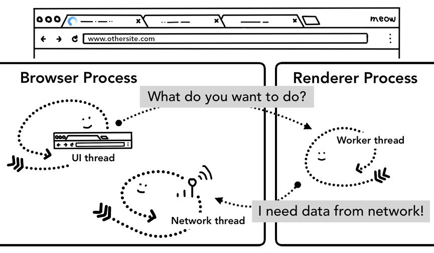 我们知道浏览器选项卡之外的工作主要是由Browser Process控制的。 Browser Process进一步划分这些任务并使用不同的线程进行处理: