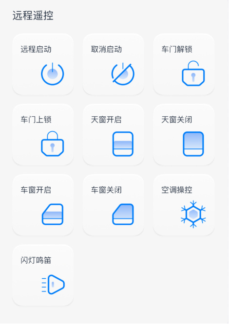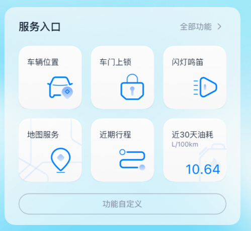 下面是【服务入口】系统。 车主可以自定义多达12项,包括车辆位置、车门锁止、天窗开启、空调控制、远程启动等非常实用的功能。
