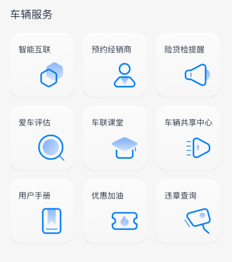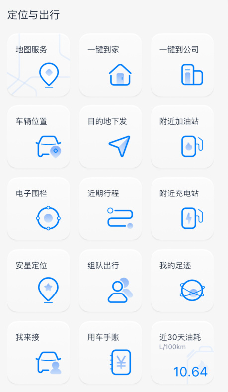 【服务入口】下的子菜单包含多个集合,其中【远程控制】可以控制车辆; 【定位出行】涵盖一键回家/工作等常用搜索功能,还可以提供一键导航到最近的加油站(可以提前显示您想去的加油站的油价) )充电桩或停车场服务; *电子围栏和车辆定位功能,轻松掌握车辆位置和情况; 【车辆服务】可查询交通违法行为; 【生活服务】】可关联电驾、安吉星商场等。
