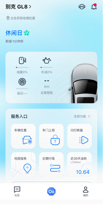 打开安吉星APP。 10.0版本下界面更加简洁。 App下方的导航栏明显将最常用的模块从之前的5个减少到3个,分别是【社区】、【开启】和【我的】。
