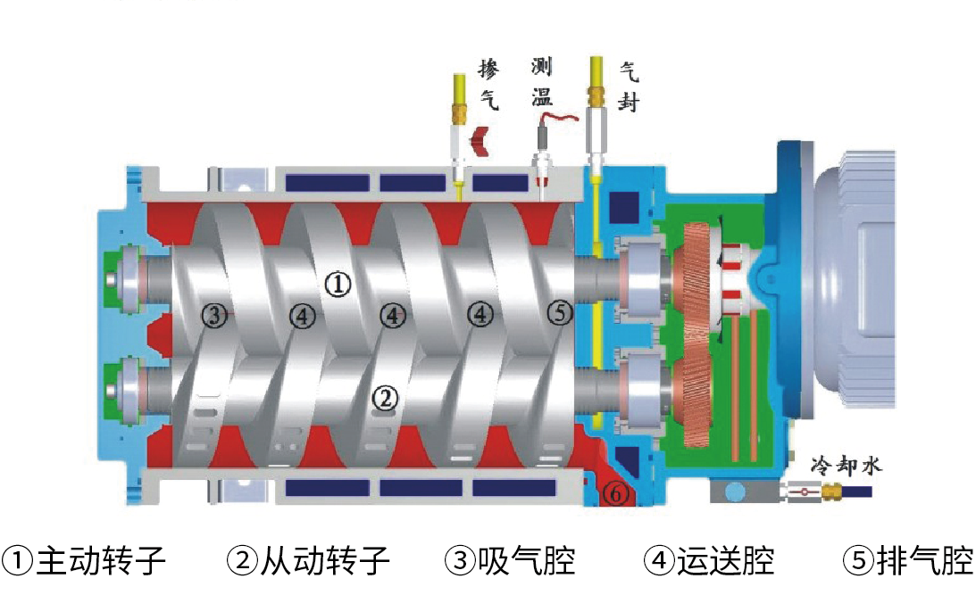 螺杆真空泵利用一对螺杆在泵壳中作同步高速反向旋转,进而产生吸气和排气作用。