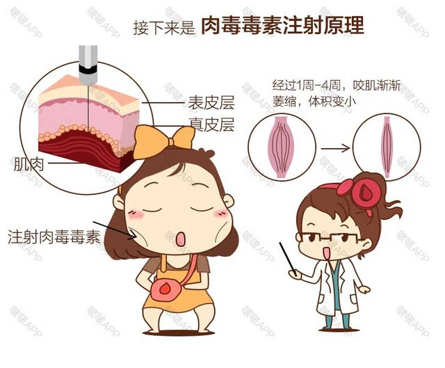 肉毒素瘦脸的原理是阻断神经与肌肉的神经冲动瘦脸针肉毒素中毒,让过度收缩的肌肉松弛,麻痹过于发达的肌肉瘦脸针肉毒素中毒,它是利用麻痹肌肉来达到“失能性的萎缩”的目的,使的原本肥厚增生的肌肉缩小,达到小脸的功效。