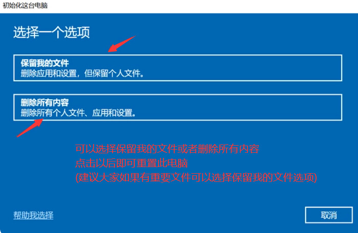 第四步:从弹出的两个选项中进行选择。 如果您的计算机上有重要文件,请选择[保留我的文件],如果没有,请选择另一个。 单击以重置此计算机。