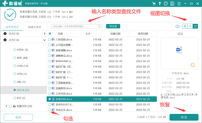 步骤2、扫描完成后,在结果中找到需要恢复的文件数据。 扫描结果中的文件类型位于左侧。 当然,如果你知道文件名或类型,可以在上面的搜索框中快速搜索。 您可以随意切换视图并勾选该框。 选择需要恢复的文件数据,点击“恢复”!