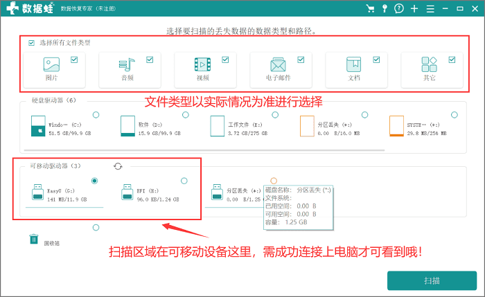 步骤1:确保U盘与电脑成功连接,且U盘数据可以被识别。 复制软件链接并从官网下载。 然后打开软件。 在扫描界面,选择所有文件类型,选择U盘(U盘需要成功连接电脑才能显示)。 选择后,继续【扫描】。