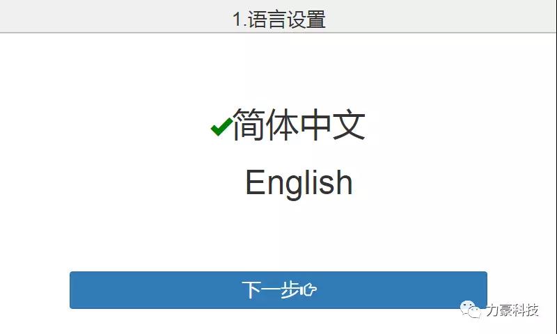 1.2 HMI第一次上电或恢复出厂设置后(HMI背面有RST复位按钮),会进入语言设置界面。 您可以选择[简体中文]或[英文]。 点击【下一步】进入下一步网络设置。 界面。