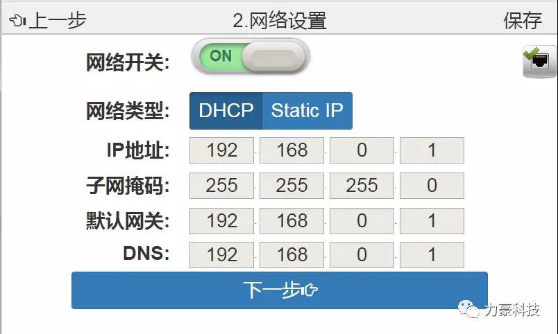 网络类型:动态或静态(深色表示当前选择)。 如果是DHCP,可以自动获取网络地址。 如果是静态IP,则需要手动填写网络地址信息(包括IP地址、子网掩码、默认网关、DNS信息)。 ),如果上一步设置错误,可以点击【上一步】。