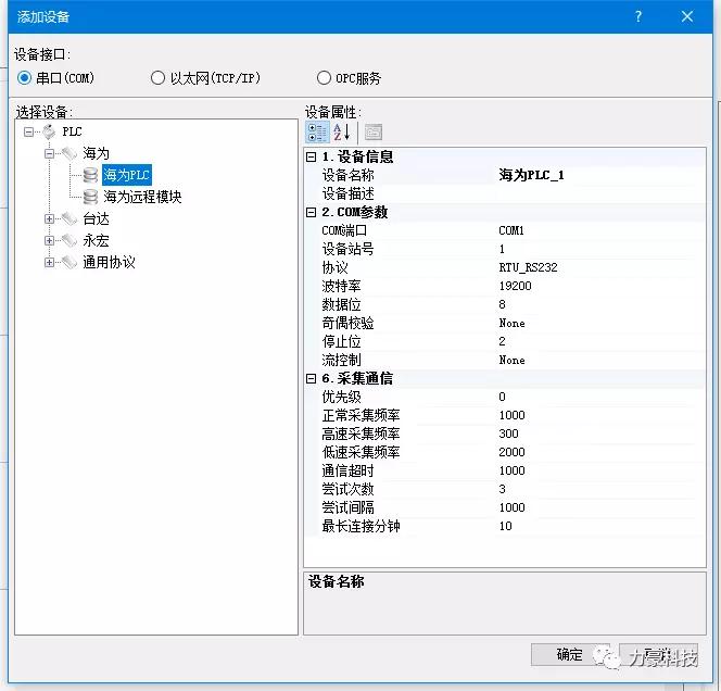 您可以添加串口 485/232 或以太网端口。 通讯参数必须与PLC上的参数一致。 海为PLC串口默认参数:地址为1,波特率为19200,数据格式为N、8、2。