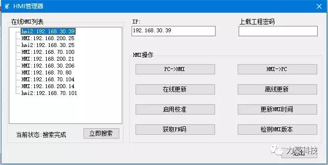 2.3 下载触摸屏程序:在配置软件中点击HMI,选择【HMI Manager】,弹出HMI Manager窗口,在在线HMI列表中选择IP地址或在IP中手动输入触摸屏上设置的IP地址栏,如之前触摸屏上设置的IP地址为192.168.30.39。 用鼠标点击对应的IP,即可将该IP对应的触摸屏设置为当前操作的触摸屏,并显示在IP栏中。